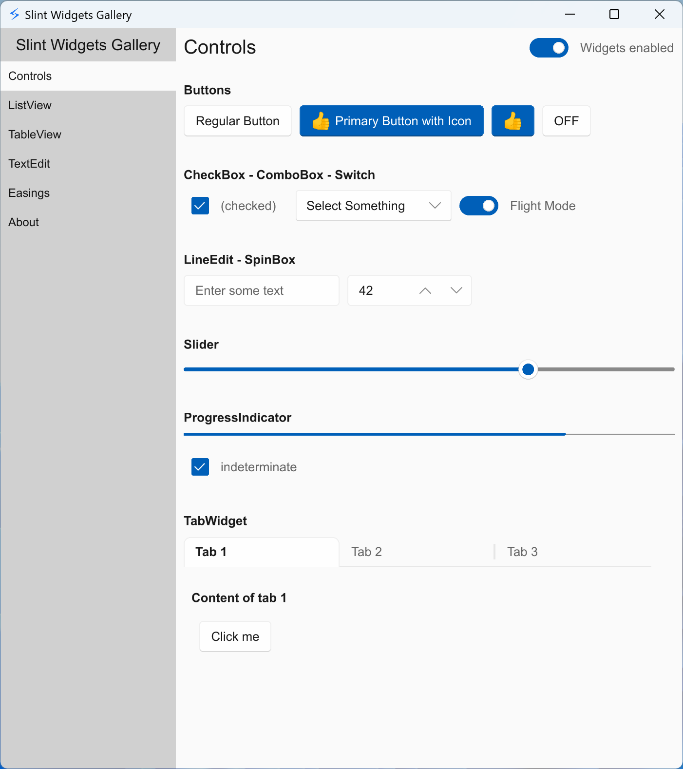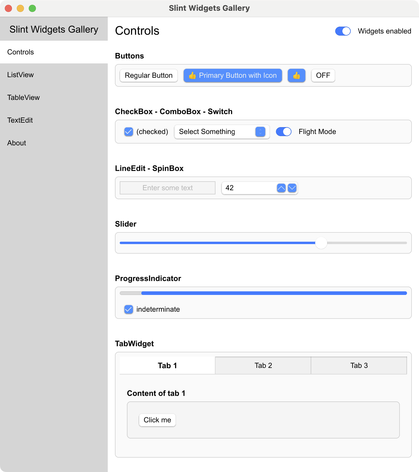 Our default styles have been changed to provide a more authentic Windows and macOS interface. The Fluent design system is used in modern Windows applications, while the Cupertino style mirrors the look and feel of macOS applications. Both styles are implemented in pure Slint code.